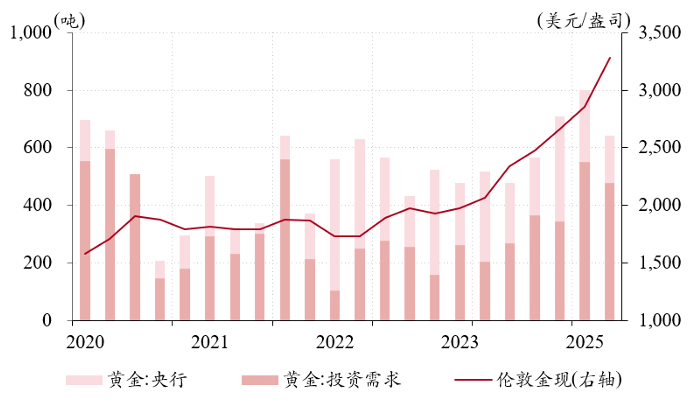 尽管央行购金持续为黄金市场提供坚实支撑,但近期金价的强劲走势更多源自民间投资的推动。自去年初伦敦现货黄金价格突破2000美元/盎司大关以来,国际金价不断创出历史新高。截至今年9月17日,国际金价已攀升至3700美元/盎司附近。在2023年和2024年连续两年上涨、累计涨幅达44.1%的基础上,今年以来黄金价格再度上涨41.0%。但与前些年国际金价上涨主要由央行购金驱动不同,今年金价上涨主要由民间投资购金驱动。据世界黄金协会统计,今年上半年,全球投资性购金需求累计达1028吨,同比、环比分别大幅增长117.3%和45.1%;而同期,央行累计购金量为415吨,同比和环比分别下降20.9%和26.5%。